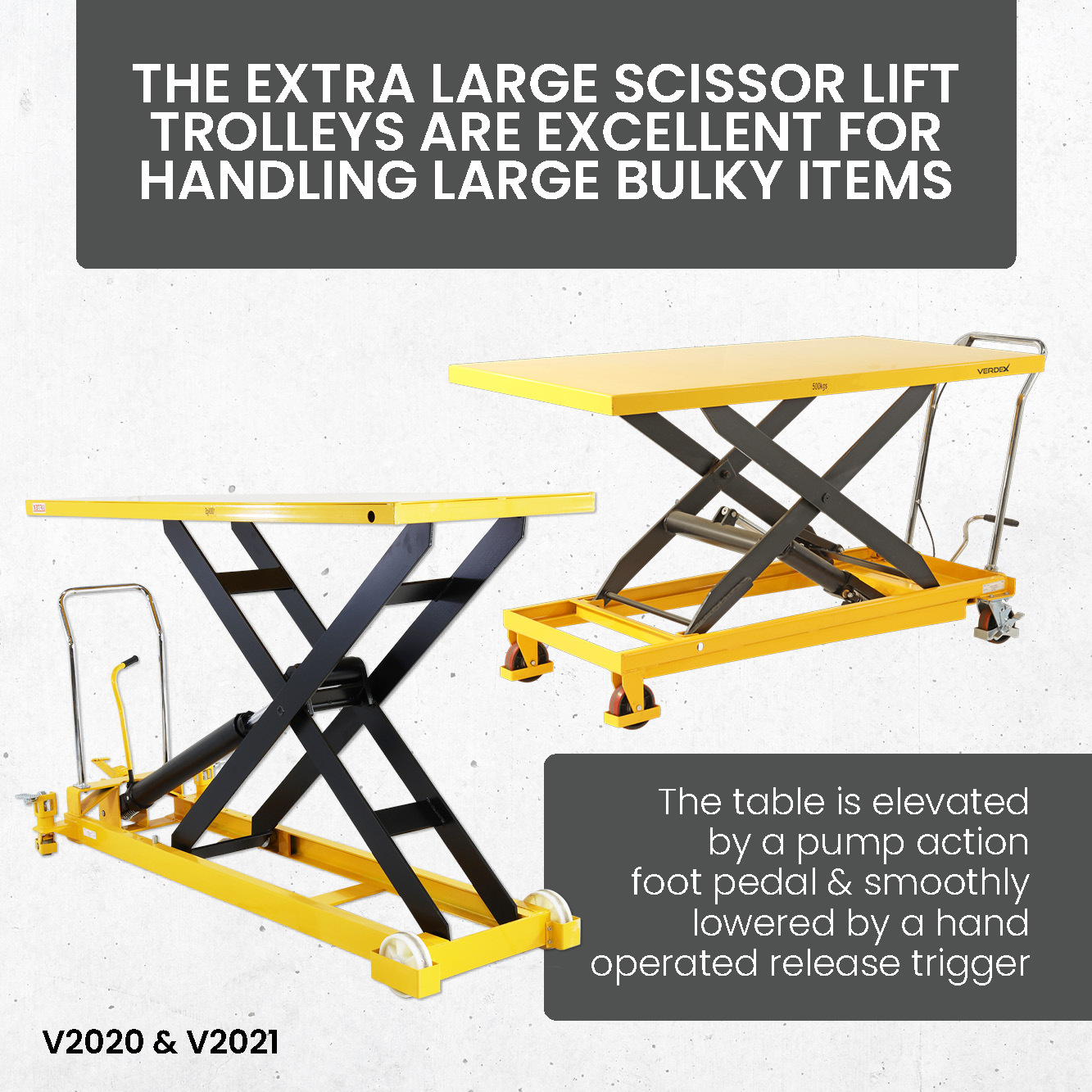 • The extra large scissor lift trolleys are excellent for handling large bulky items.
